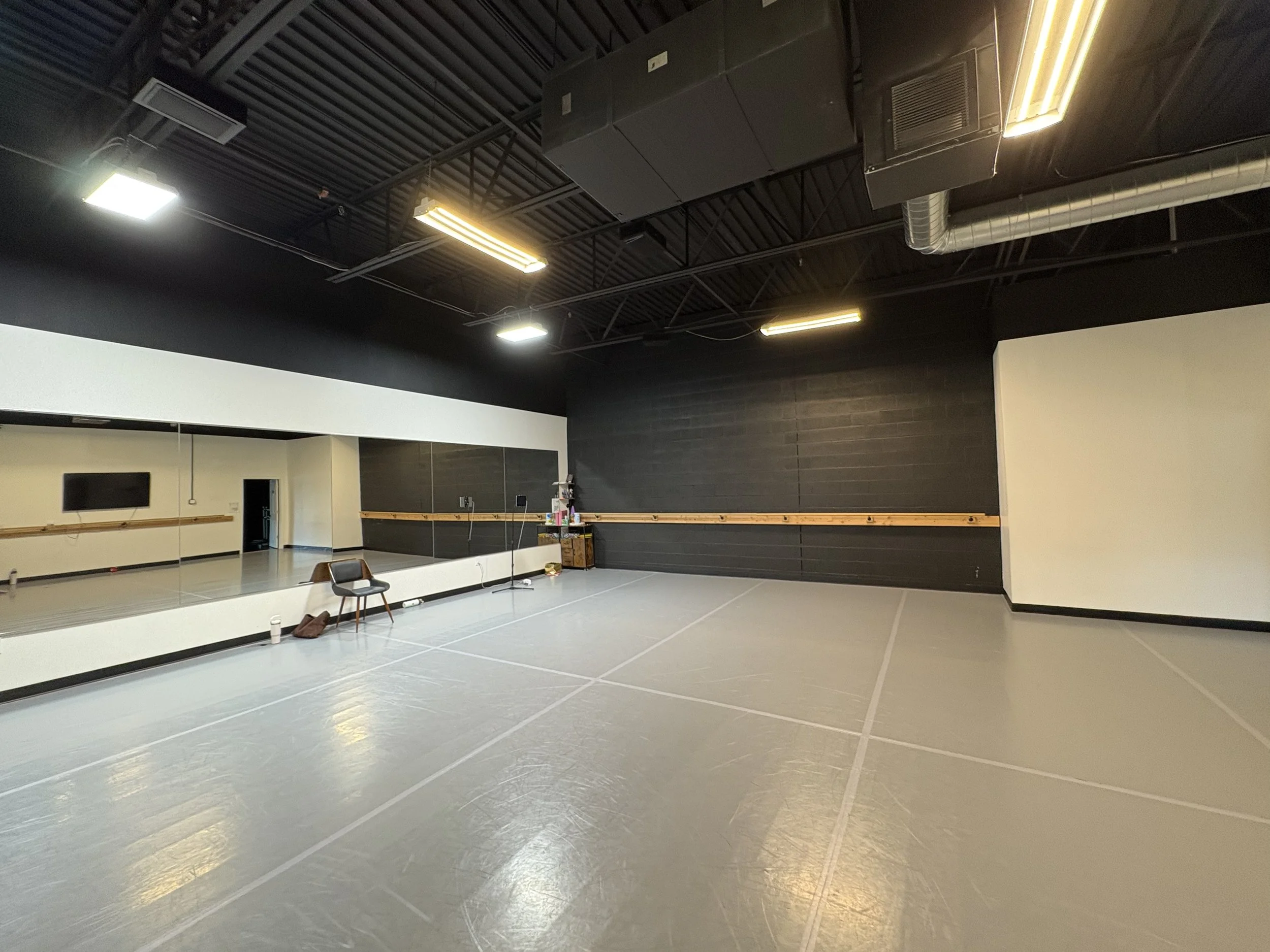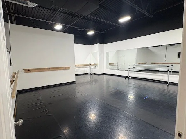 Space description: 2 large studios with mirrors and barres; 1 smaller studio with mirrors and barres; lobby/waiting area; single bathroom.
